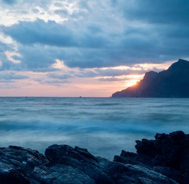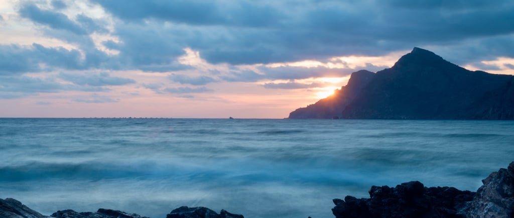 Llegados al lugar de la sesión, playa bajo el faro de Portman, comienza a caer la tarde sobre la bahía y el escenario se presenta prometedor. Las nubes como un manto suave cubren parcialmente el Sol que desciende despacio y constante hacía el ocaso del día. El mar está bravo pero menos que un Miura, dejando estelas sobre el agua muy fotografiables y con figuras dispares salpicando las rocas.