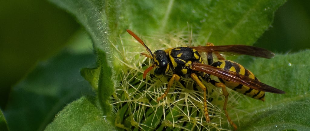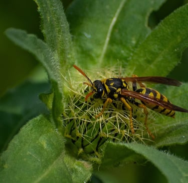 La vegetación, debido a la abundancia de lluvias que hemos tenido, es exuberante y ofrece un sin fin de formas, colores y olores. Sobre la diversidad de flores veo que las avispas y abejas hacen acto de presencia y saltan impregnadas de polen de una a otra, sin preocupación y con toda la belleza del batir de sus alas. La fotografía a estos insectos es difícil de obtener porque se mueven a velocidades muy altas y por ello el enfoque tiene que ser preciso. En mi cámara es bueno pero no excelente. Ráfaga activa y con velocidades de disparo entorno a 1/2000 comienzo a componer escenas y a obligarme a esa flexión del cuerpo y contorsión que a veces hace que se resienta. Paciencia y atención son fundamentales para conseguir si quiera una imagen que merezca la pena.