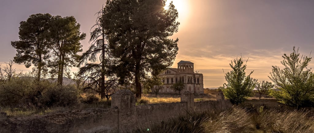 El lugar es cuanto menos sorprendente. Está rodeado de tierras de labranza cerca de La Copa de Bullas y en la zona más verde y con grandes árboles que rodean la finca y la habitan en lo que algún día fueron fuentes y jardines. Hoy desgraciadamente no está en su mejor momento y mucho me temo que con el paso del tiempo y descuido que sufre terminará por derrumbarse por completo.