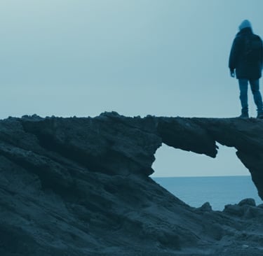 Cabo Cervera ofrece una orografía única en Torrevieja, con sus grietas profundas y sus pozas de agua que actúan como espejos. En la fotografía se puede apreciar cómo las líneas naturales de la roca dirigen la atención hacia la figura central. Esa estructura geológica aporta una fuerza visual que equilibra la suavidad del cielo grisáceo que domina la parte superior. La elección del encuadre permite que el espectador sienta la inmensidad del espacio, resaltando la pequeña escala del ser humano. Es en este diálogo entre la tierra firme y el agua cambiante donde reside la verdadera magia de la costa mediterránea. La luz tamizada por las nubes elimina las sombras duras, permitiendo que los detalles de la vegetación marina resalten con fuerza. Cada grieta en el suelo cuenta los siglos de erosión que han dado forma a este icónico mirador natural de la zona.